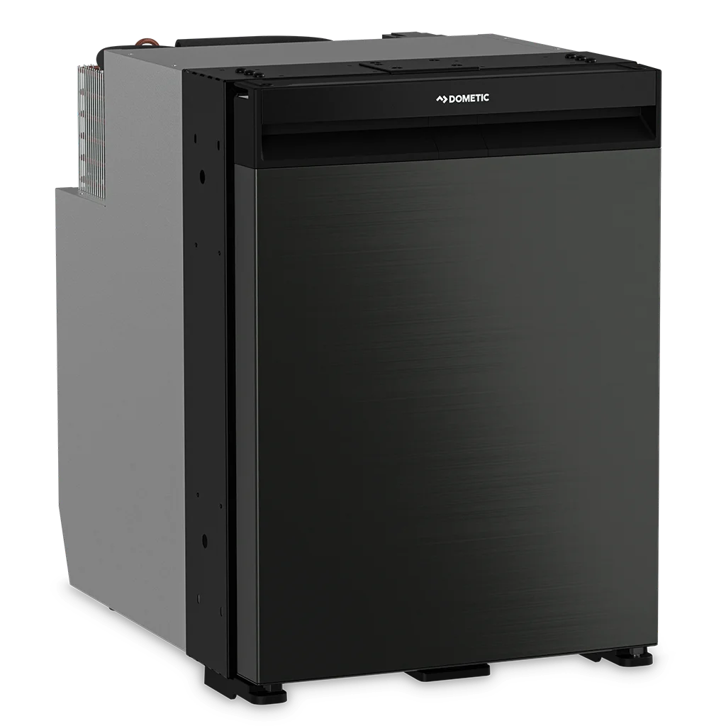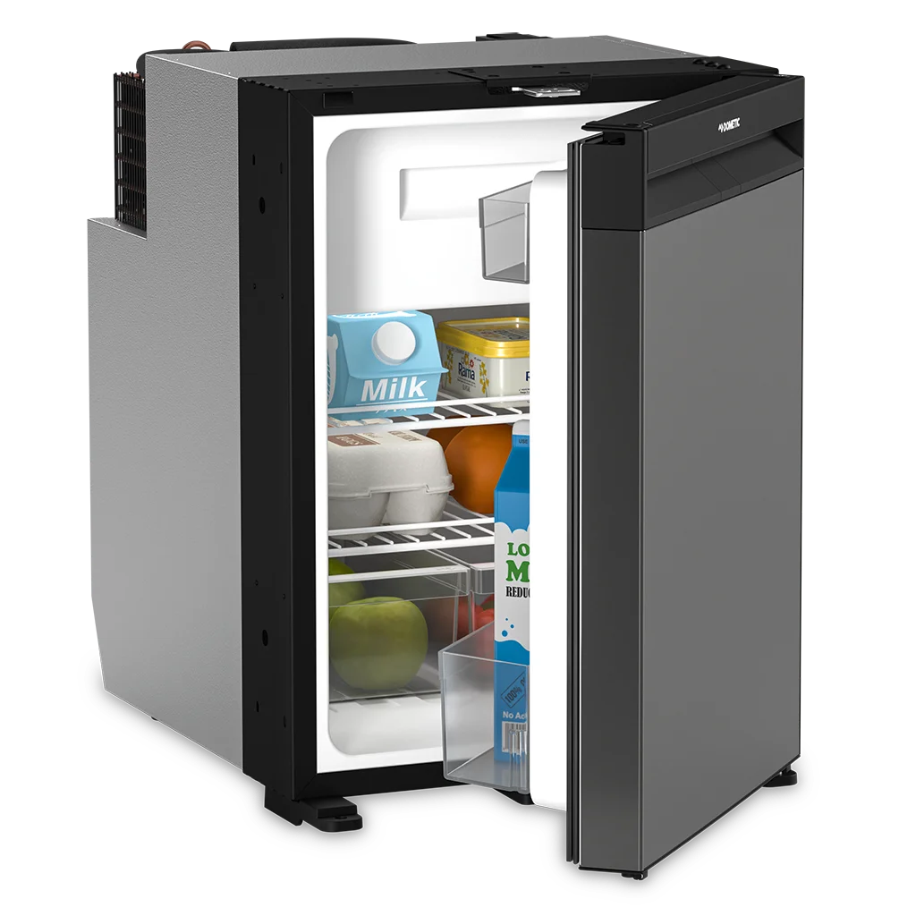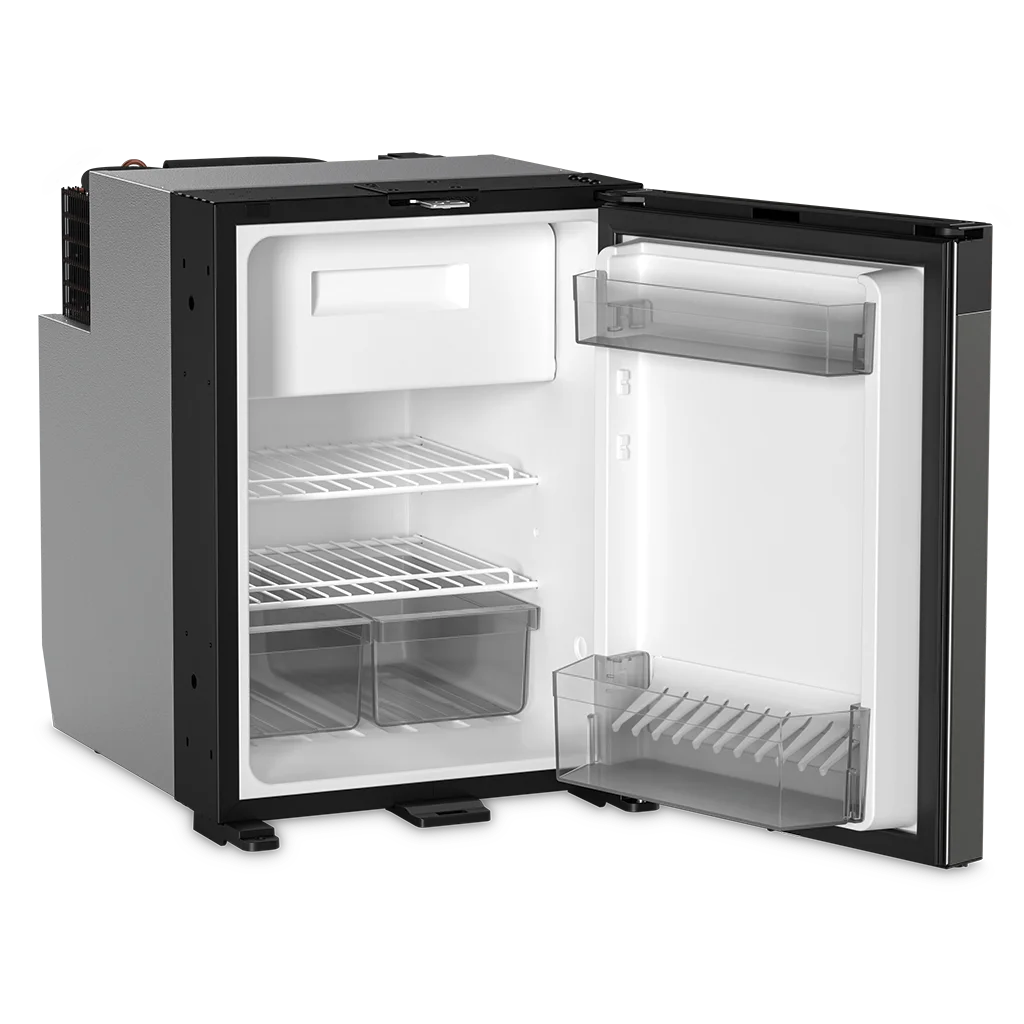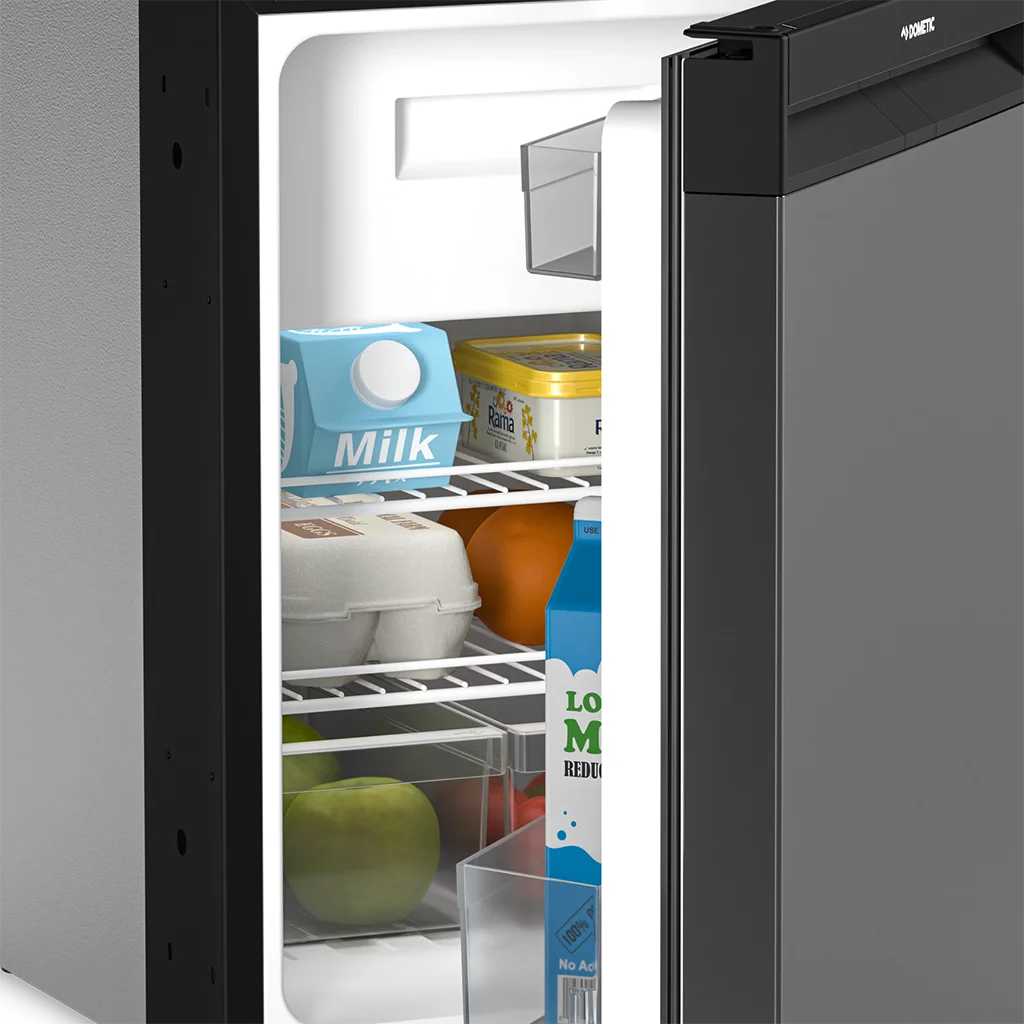 Dometic NRX 50C compressor-cooled fridge with 46 litre capacity and dark silver front. Featuring a fresh design and superior energy efficiency: this smart compressor refrigerator provides 46 l of cool storage. Its elegant frameless door, incorporating a dark silver front panel and a convenient full-width handle, opens to a versatile interior. You can easily remove the 4.4 l freezer compartment to use the full cabinet capacity for refrigeration or deep-freezing.