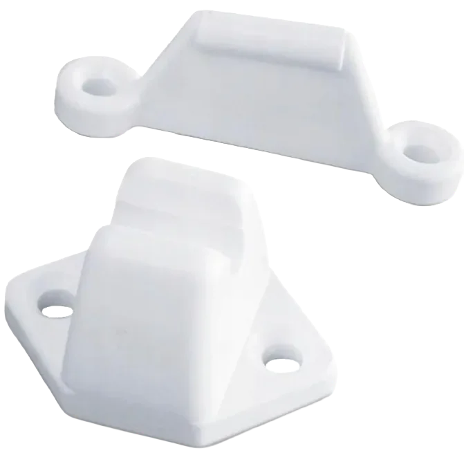 Fawo t-bar door retainer in white. 2 part white plastic, exterior mounted. male part 60mm long with hole centres 46mm. female part 45mm long with hole centres 30mm. pack of 10.