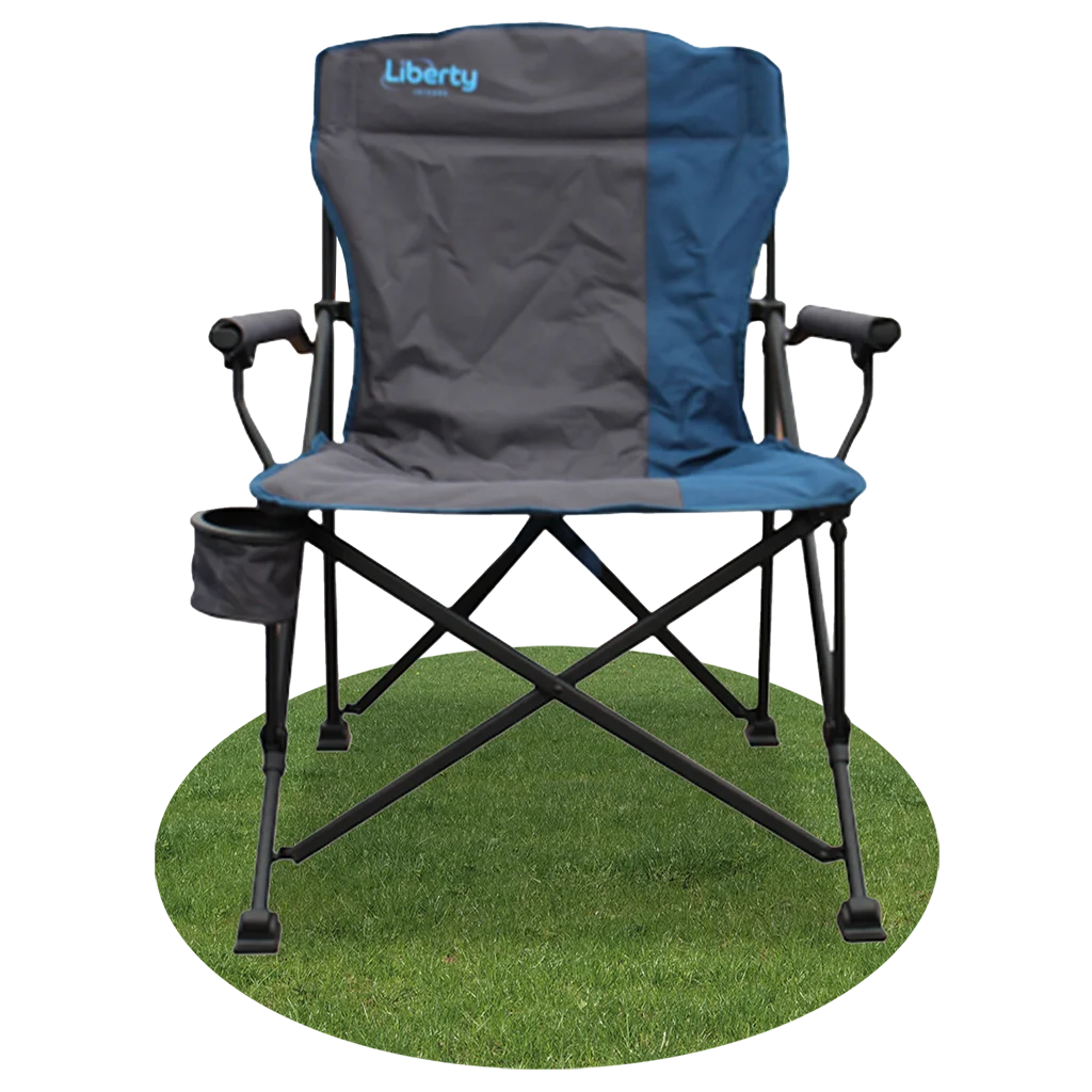 This is the Liberty Leisure Outdoors folding chair, which comes in 5 different colours. It has a high back for added support, a strong and sturdy powder coated steel frame and completed with an excellent 600D oxford polyester fabric which is both durable and easy to clean. Unlike the majority of its rivals this folding chair has solid arms for additional support making it easier to get in and out off. It is padded for your comfort and packs away when not in use making it easy to carry and store away. it comes with it’s own colour coded carry bag helping you move and carry it plus helping to protect it when not in use. Finished off with a handy can holder on the frame this folding chair is not only strong, durable but also comfortable and feature laden.