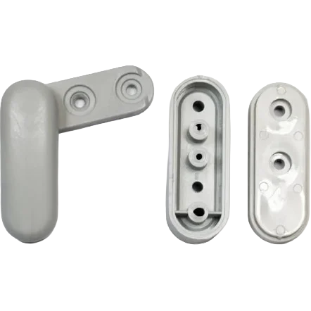 Remis shower door catch. includes catch and spacer, 45mm center distance. light grey in colour and made from plastic. 53mm in length with a 30mm screw centre.
