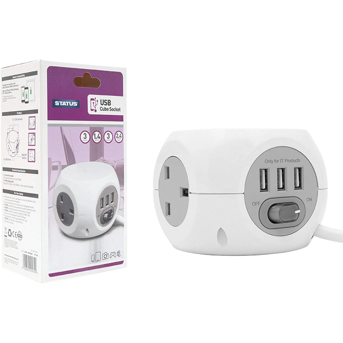 3 way cube with 3 x usb – white. s3w1.4m3xusb1pk6. colour white. product features . 3-way cube socket. 3 usb ports. switched sockets. 1.4m cable.