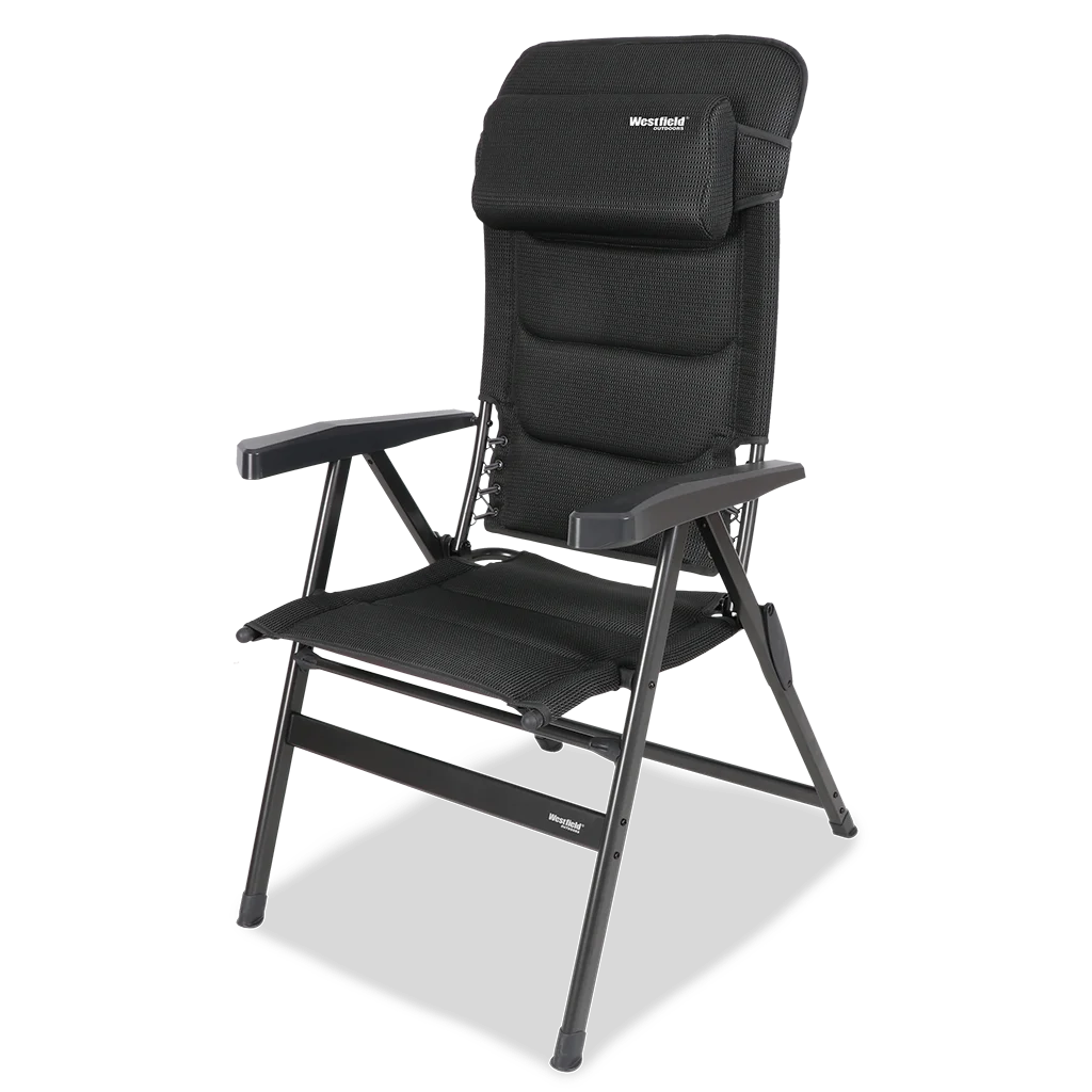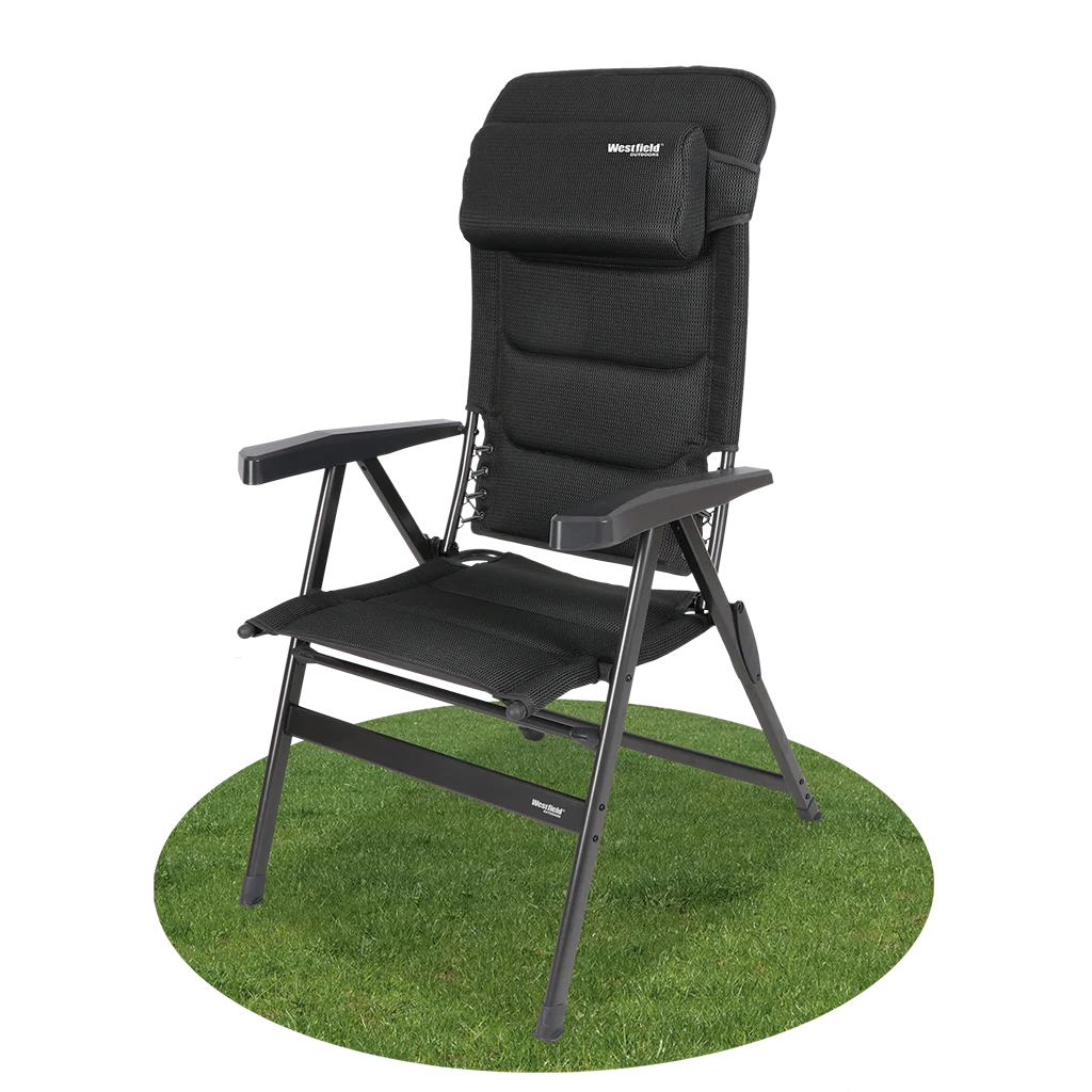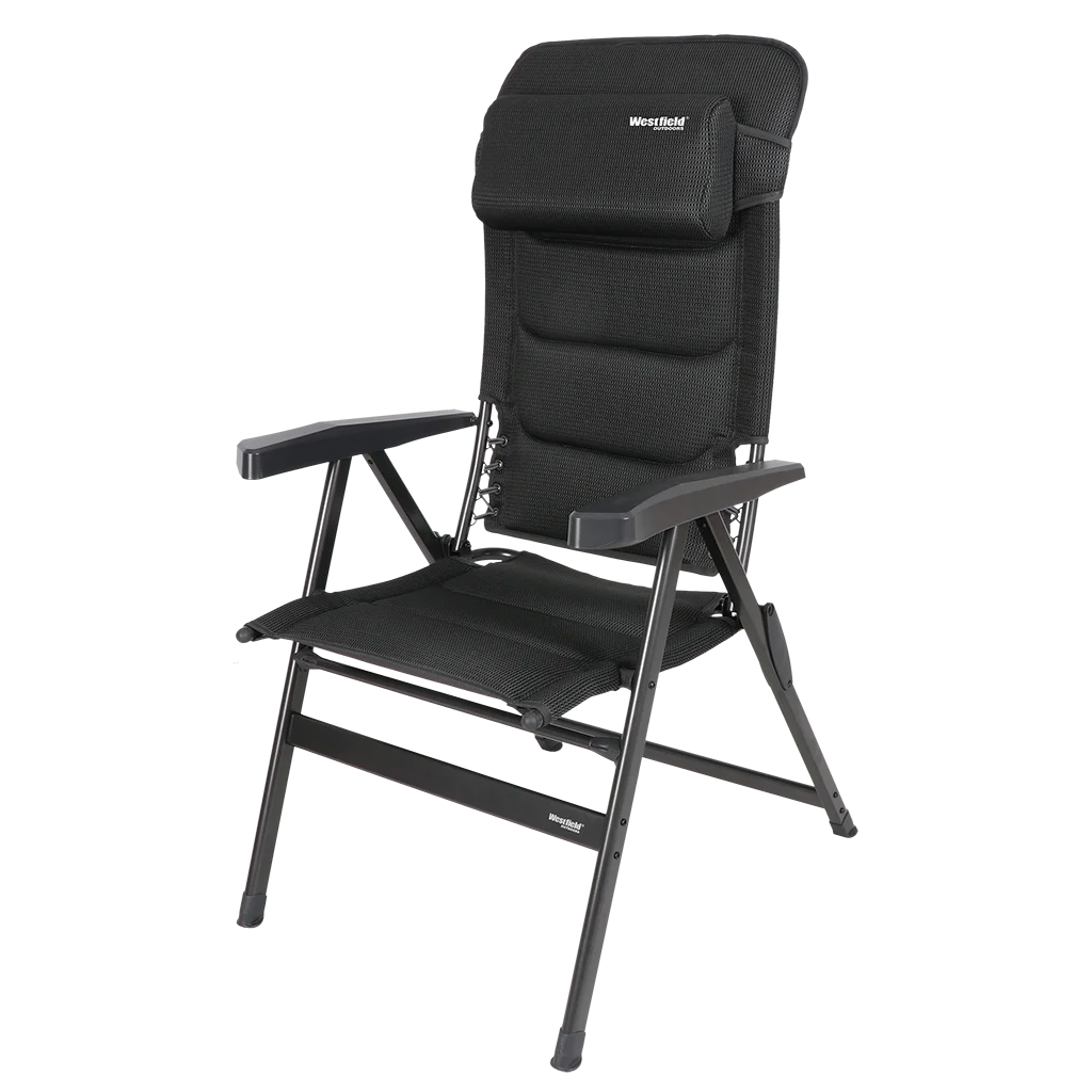 This is a premium Westfield Outdoors folding chair. It reclines for added comfort, has an ergonomic backrest with a removable and adjustable head cushion which can be used as additional lumbar support or head cushion (or removed) for even more added comfort. Solid arms give you support when getting in and out of the chair, making it easier to use and live with.